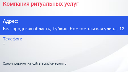 Компания ритуальных услуг по адресу Белгородская область, Губкин, Комсомольская улица, 12 в дальнейшем Организация, размещена в следующих категориях: