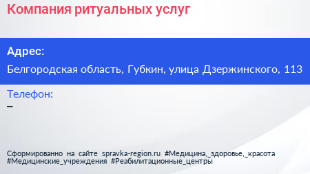 Компания ритуальных услуг по адресу Белгородская область, Губкин, улица Дзержинского, 113 в дальнейшем Организация, размещена в следующих категориях: