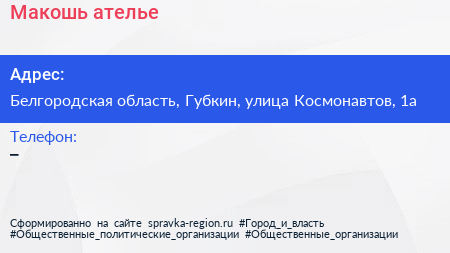 Макошь, ателье по адресу Белгородская область, Губкин, улица Космонавтов, 1а в дальнейшем Организация, размещена в следующих категориях: