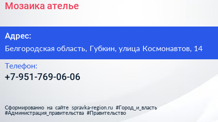 Мозаика, ателье по адресу Белгородская область, Губкин, улица Космонавтов, 14 в дальнейшем Организация, размещена в следующих категориях: