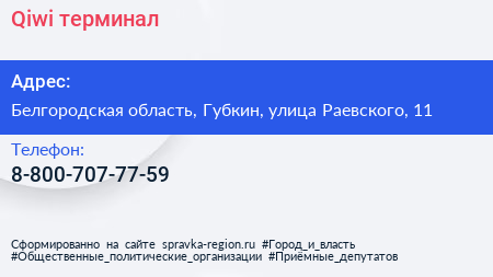 Qiwi, терминал по адресу Белгородская область, Губкин, улица Раевского, 11 в дальнейшем Организация, размещена в следующих категориях: