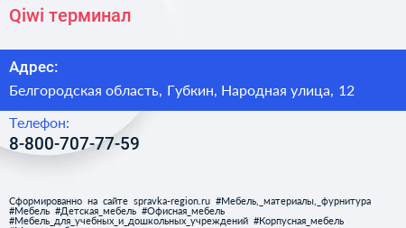 Qiwi, терминал по адресу Белгородская область, Губкин, Народная улица, 12 в дальнейшем Организация, размещена в следующих категориях: