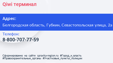 Qiwi, терминал по адресу Белгородская область, Губкин, Севастопольская улица, 2а в дальнейшем Организация, размещена в следующих категориях: