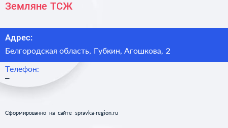 Земляне, ТСЖ по адресу Белгородская область, Губкин, Агошкова, 2 в дальнейшем Организация, размещена в следующих категориях: