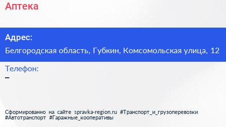 Аптека по адресу Белгородская область, Губкин, Комсомольская улица, 12 в дальнейшем Организация, размещена в следующих категориях: