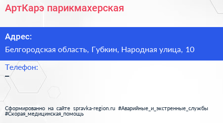 АртКарэ, парикмахерская по адресу Белгородская область, Губкин, Народная улица, 10 в дальнейшем Организация, размещена в следующих категориях: