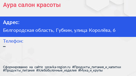 Аура, салон красоты по адресу Белгородская область, Губкин, улица Королёва, 6 в дальнейшем Организация, размещена в следующих категориях:
