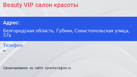 Beauty VIP, салон красоты по адресу Белгородская область, Губкин, Севастопольская улица, 57а в дальнейшем Организация, размещена в следующих категориях: