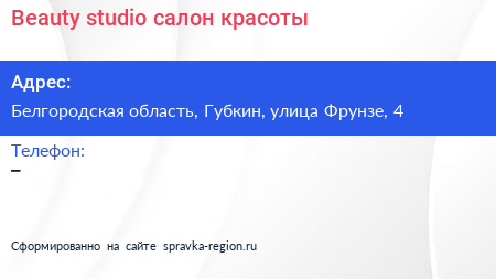 Beauty studio, салон красоты по адресу Белгородская область, Губкин, улица Фрунзе, 4 в дальнейшем Организация, размещена в следующих категориях: