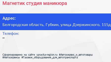 Магнетик, студия маникюра по адресу Белгородская область, Губкин, улица Дзержинского, 115д в дальнейшем Организация, размещена в следующих категориях: