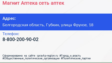 Магнит Аптека, сеть аптек по адресу Белгородская область, Губкин, улица Фрунзе, 18 в дальнейшем Организация, размещена в следующих категориях: