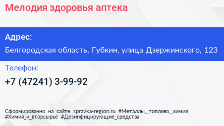 Мелодия здоровья, аптека по адресу Белгородская область, Губкин, улица Дзержинского, 123 в дальнейшем Организация, размещена в следующих категориях: