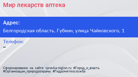 Мир лекарств, аптека по адресу Белгородская область, Губкин, улица Чайковского, 1 в дальнейшем Организация, размещена в следующих категориях: