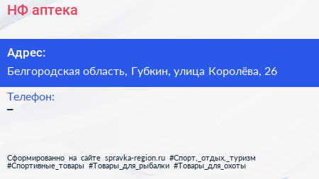 НФ, аптека по адресу Белгородская область, Губкин, улица Королёва, 26 в дальнейшем Организация, размещена в следующих категориях: