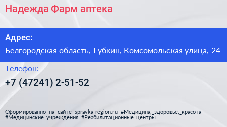 Надежда-Фарм, аптека по адресу Белгородская область, Губкин, Комсомольская улица, 24 в дальнейшем Организация, размещена в следующих категориях: