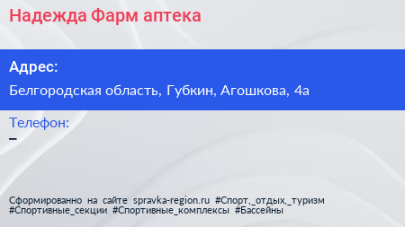 Надежда-Фарм, аптека по адресу Белгородская область, Губкин, Агошкова, 4а в дальнейшем Организация, размещена в следующих категориях:
