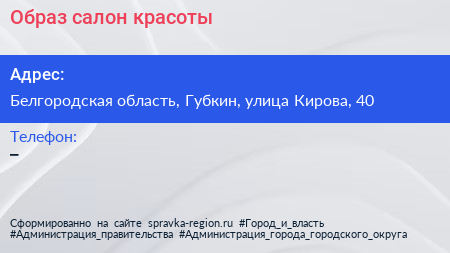 Образ, салон красоты по адресу Белгородская область, Губкин, улица Кирова, 40 в дальнейшем Организация, размещена в следующих категориях: