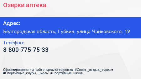 Озерки, аптека по адресу Белгородская область, Губкин, улица Чайковского, 19 в дальнейшем Организация, размещена в следующих категориях: