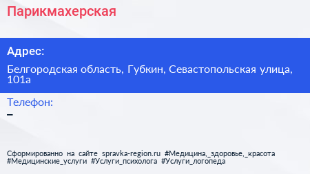 Парикмахерская по адресу Белгородская область, Губкин, Севастопольская улица, 101а в дальнейшем Организация, размещена в следующих категориях: