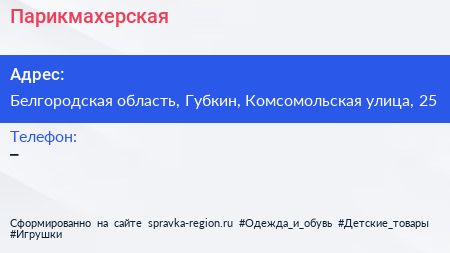 Парикмахерская по адресу Белгородская область, Губкин, Комсомольская улица, 25 в дальнейшем Организация, размещена в следующих категориях: