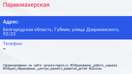 Парикмахерская по адресу Белгородская область, Губкин, улица Дзержинского, 92/23 в дальнейшем Организация, размещена в следующих категориях:
