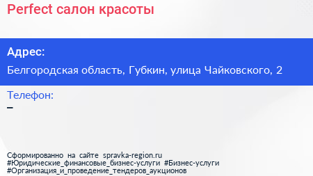 Perfect, салон красоты по адресу Белгородская область, Губкин, улица Чайковского, 2 в дальнейшем Организация, размещена в следующих категориях: