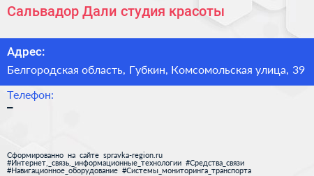 Сальвадор Дали, студия красоты по адресу Белгородская область, Губкин, Комсомольская улица, 39 в дальнейшем Организация, размещена в следующих категориях: