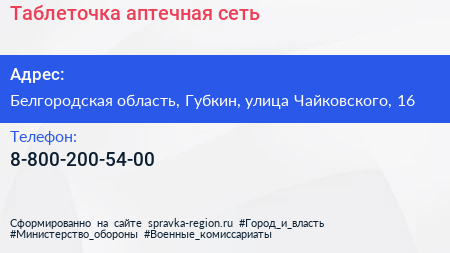 Таблеточка, аптечная сеть по адресу Белгородская область, Губкин, улица Чайковского, 16 в дальнейшем Организация, размещена в следующих категориях: