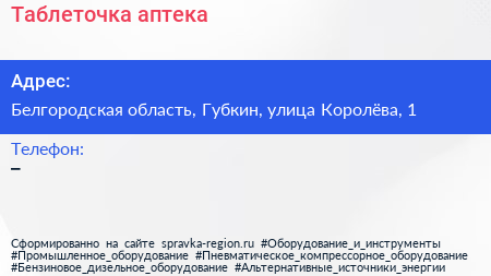 Таблеточка, аптека по адресу Белгородская область, Губкин, улица Королёва, 1 в дальнейшем Организация, размещена в следующих категориях:
