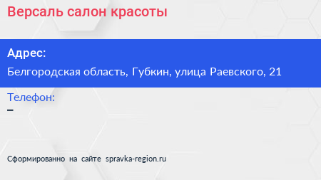 Версаль, салон красоты по адресу Белгородская область, Губкин, улица Раевского, 21 в дальнейшем Организация, размещена в следующих категориях: