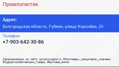 Промлогистик по адресу Белгородская область, Губкин, улица Королёва, 25 в дальнейшем Организация, размещена в следующих категориях: