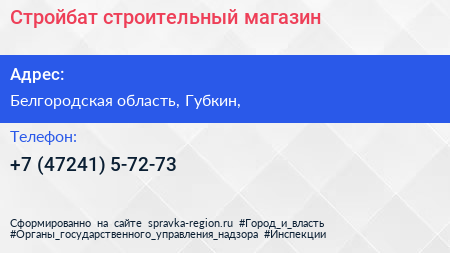 Стройбат, строительный магазин по адресу Белгородская область, Губкин, в дальнейшем Организация, размещена в следующих категориях: