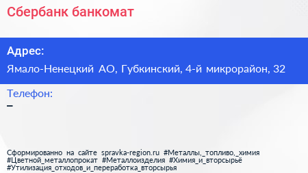 Сбербанк, банкомат по адресу Ямало-Ненецкий АО, Губкинский, 4-й микрорайон, 32 в дальнейшем Организация, размещена в следующих категориях: