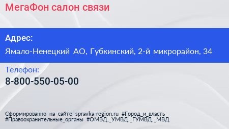 МегаФон, салон связи по адресу Ямало-Ненецкий АО, Губкинский, 2-й микрорайон, 34 в дальнейшем Организация, размещена в следующих категориях: