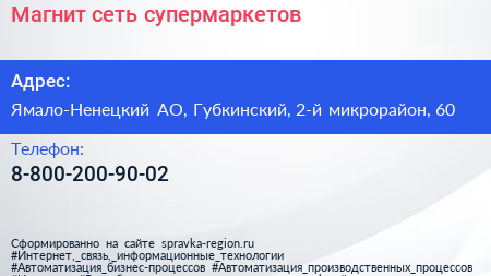 Магнит, сеть супермаркетов по адресу Ямало-Ненецкий АО, Губкинский, 2-й микрорайон, 60 в дальнейшем Организация, размещена в следующих категориях: