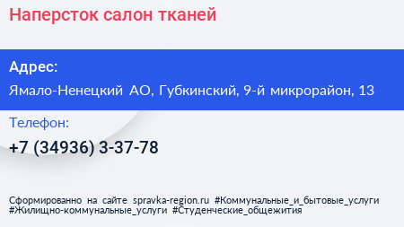 Наперсток, салон тканей по адресу Ямало-Ненецкий АО, Губкинский, 9-й микрорайон, 13 в дальнейшем Организация, размещена в следующих категориях: