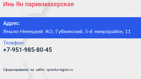 Инь-Ян, парикмахерская по адресу Ямало-Ненецкий АО, Губкинский, 5-й микрорайон, 11 в дальнейшем Организация, размещена в следующих категориях: