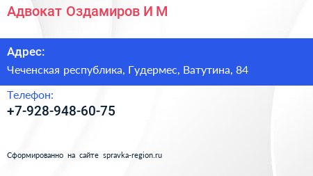 Адвокат Оздамиров И.М. по адресу Чеченская республика, Гудермес, Ватутина, 84 в дальнейшем Организация, размещена в следующих категориях:
