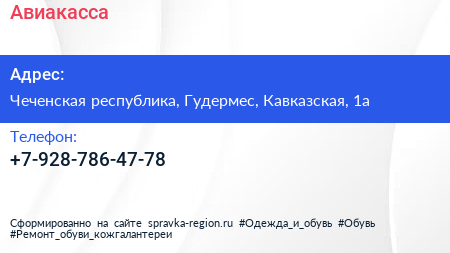 Авиакасса по адресу Чеченская республика, Гудермес, Кавказская, 1а в дальнейшем Организация, размещена в следующих категориях: