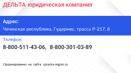 ДЕЛЬТА, юридическая компания по адресу Чеченская республика, Гудермес, трасса Р-217, 8 в дальнейшем Организация, размещена в следующих категориях: