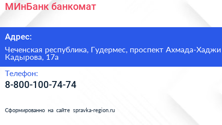 МИнБанк, банкомат по адресу Чеченская республика, Гудермес, проспект Ахмада-Хаджи Кадырова, 17а в дальнейшем Организация, размещена в следующих категориях: