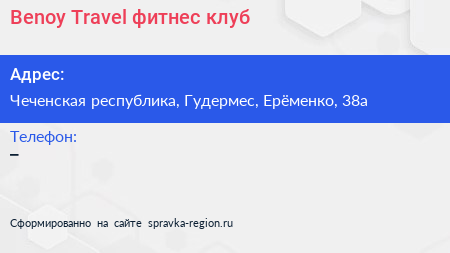 Benoy Travel, фитнес-клуб по адресу Чеченская республика, Гудермес, Ерёменко, 38а в дальнейшем Организация, размещена в следующих категориях: