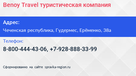 Benoy Travel, туристическая компания по адресу Чеченская республика, Гудермес, Ерёменко, 38а в дальнейшем Организация, размещена в следующих категориях:
