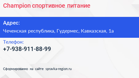 Champion, спортивное питание по адресу Чеченская республика, Гудермес, Кавказская, 1а в дальнейшем Организация, размещена в следующих категориях: