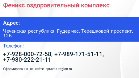 Феникс, оздоровительный комплекс по адресу Чеченская республика, Гудермес, Терешковой проспект, 12Б в дальнейшем Организация, размещена в следующих категориях: