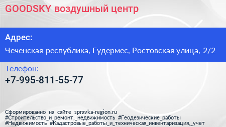 GOODSKY, воздушный центр по адресу Чеченская республика, Гудермес, Ростовская улица, 2/2 в дальнейшем Организация, размещена в следующих категориях: