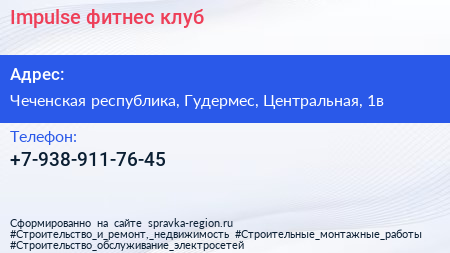 Impulse, фитнес-клуб по адресу Чеченская республика, Гудермес, Центральная, 1в в дальнейшем Организация, размещена в следующих категориях: