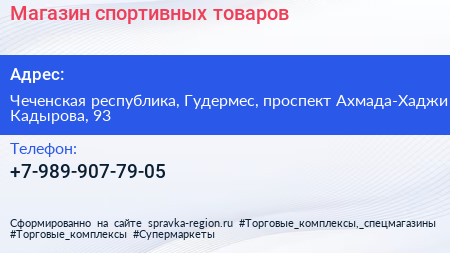 Магазин спортивных товаров по адресу Чеченская республика, Гудермес, проспект Ахмада-Хаджи Кадырова, 93 в дальнейшем Организация, размещена в следующих категориях: