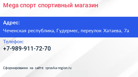 Mega спорт, спортивный магазин по адресу Чеченская республика, Гудермес, переулок Хатаева, 7а в дальнейшем Организация, размещена в следующих категориях: