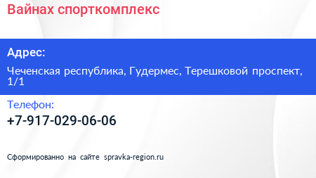 Вайнах, спорткомплекс по адресу Чеченская республика, Гудермес, Терешковой проспект, 1/1 в дальнейшем Организация, размещена в следующих категориях:
